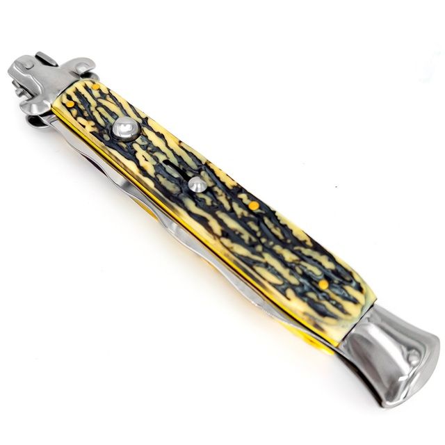 11" Big Boss Faux Stag Milano Stiletto Automatic Switch Blade Kriss Knife. If you need a knife that’ll send a message, this Big Boss Faux Stag Milano Stiletto is the knife for you! You’ll leave your attacker quaking in their boots when you pull out this bad boy, that’s for sure. This menacing automatic stiletto knife features a near 6-inch stainless-steel blade with a mirror polish finish, as well as an impressive faux stag handle. To open the knife, you will press the shiny silver button at the top of the handle. To close, push the silver t-shaped bolster above the handle toward the base with your thumb. A slide lock on the handle prevents accidental opening while not in use. Included with this knife is a free black nylon quick release sheath with belt loop for easy carry. Overall Length: 12.50 Inches, Blade Length: 5.62 Inches
