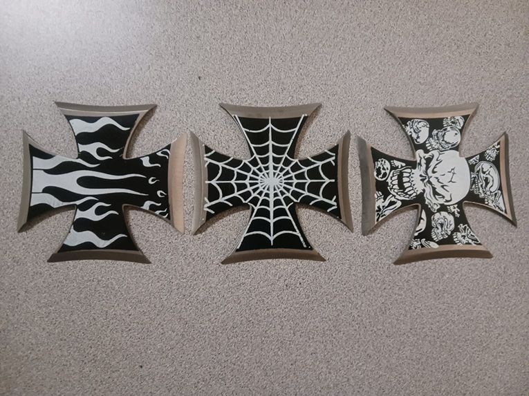 3 Piece Iron Cross Throwing Star Set with Sheath. These are old stock we found laying around. We only have a few sets of them. Each throwing star is 2.7 ounces and very sharp. The set comes with a snap sheath that holds all 3 throwing stars.
