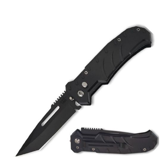 8" Open Black Ballistic Switch Blade Automatic Tanto Blade Knife. This automatic knife is excellent for everyday carry. When you need a sturdy switchblade knife for any occasion, this one will get the job done. With it's lightweight and solid design, you won't be disappointed. It feels good in your hands and has a safety switch to prevent any accidental openings. Add this easy push button knife to your collection. Specifications: 8" Overall Length 3.5" Blade Length 4.5" Closed Length Features: 420C Stainless Steel Tanto Blade Push Button Spring Assist open Safety Locking mechanism Black Aluminum Handle Pocket Clip