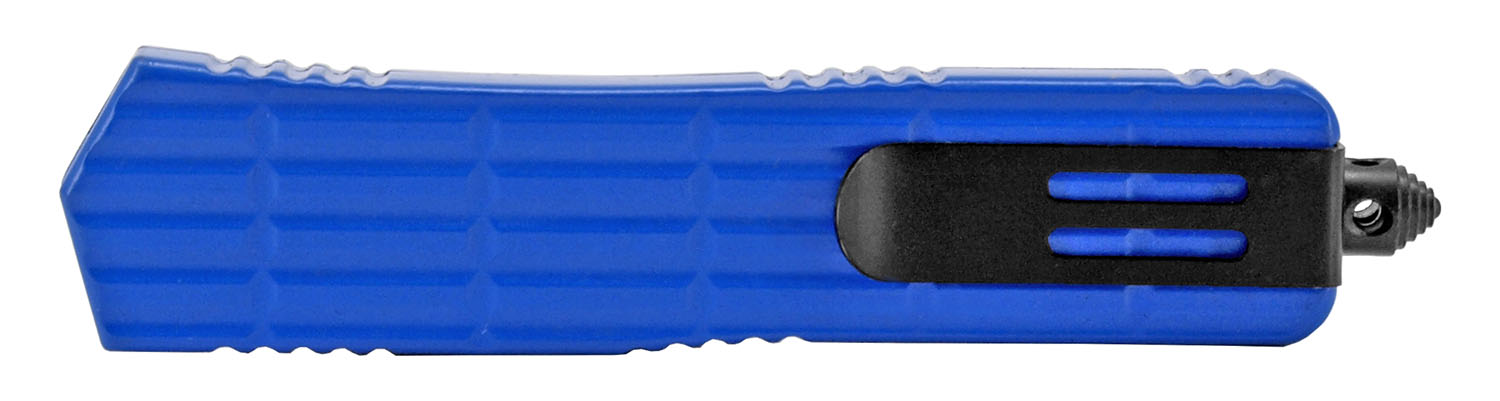 5" Shooter Blue OTF Automatic Knife Black Tanto Dagger Serrated. Blade Material 440 Stainless Steel Blade Type Serrated Folding Action Out the Front Handle Construction Stainless Steel Features Belt Clip, Glass Breaker, and Nylon Carrying Case Blade Length 3.75" Handle Length 5.38" Overall Length 9.13"