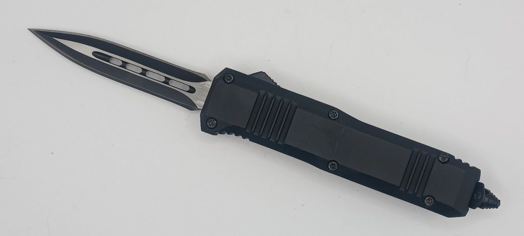 6.5" Ranger Black D/A OTF Automatic Knife Dagger Point Two Tone Plain. 6.5 inches total length 2.5" 440 stainless steel blade. comes with pocket clip, glass breaker and a belt sheath. This is old stock we found laying around. Very limited stock.
