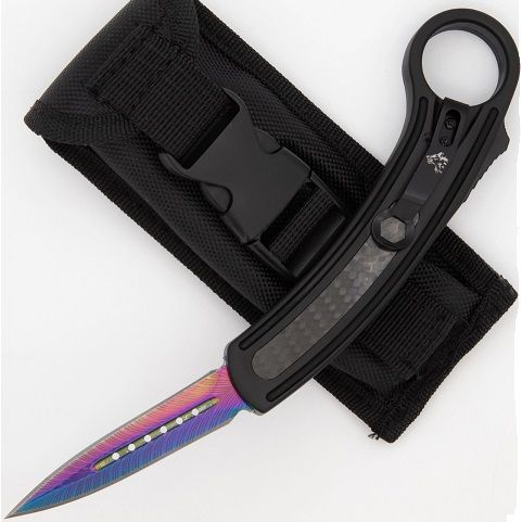 8.75" Black Carbon Fiber Karambit D/A OTF Automatic Knife Rainbow Dagger. Overall Length: 8.75 Inches Blade Length: 3.23 Inches Blade Width: 0.65 Inch Blade Thickness: 2.63 mm Blade Style: Dagger Point Blade Construction: Steel Handle Construction: Zinc Aluminum with Carbon Fiber Inlay Handle Length: 5.76 Inches Includes: Black Nylon Sheath Features: Karambit Style, Automatic Knife
