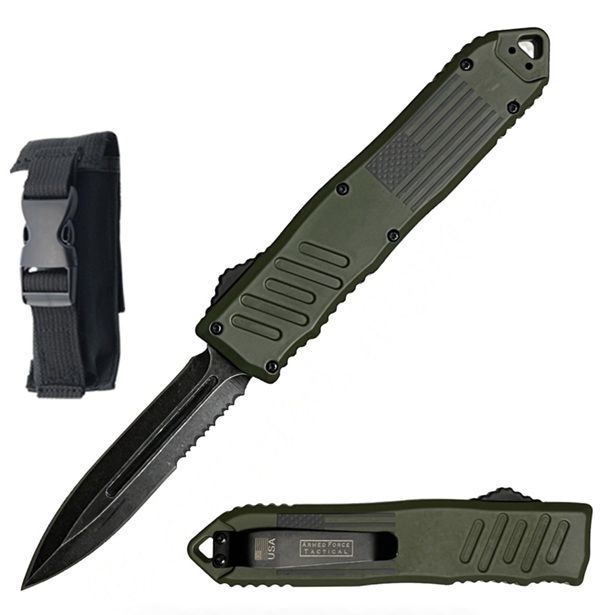 9" American Flag Army Green OTF Dual Action Automatic Knife. This exquisite OTF knife features a stone washed finish stainless steel spear point partially serrated blade. The dual action allows you to use a slider trigger located on the side of the handle to propel the blade forward as well as retract. The 3D Printed USA Flag green handle itself is made from durable zinc alloy. A steel pocket clip is featured on the handle. Overall Length 9 inches with Handle Length of 5.5 inches. Includes FREE Nylon Pouch with Belt Loop. Specifications Overall Length: 9 inch Handle Length: 5.5 inch Blade: Stone Washed Finish Spear Point Handle Material: Zinc Alloy Features Automatic Out the Front Stainless Steel Blade Zinc Alloy Green Handle with 3D Printed USA Flag Pocket Clip FREE Nylon Pouch with Belt Loop Included