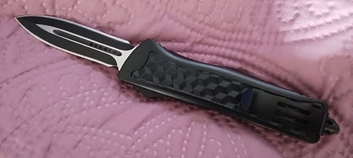 9" American Mercenary Tactical Brown D/A OTF Automatic Knife Two Tone Dagger. This American Mercenary OTF knife features a two tone black and satin finish stainless steel dagger style blade. The dual action allows you to use a slider trigger located on the side of the handle to propel the blade forward as well as retract. A steel pocket clip and handy emergency glass breaker are featured on the handle. Overall Length 9 inches with Handle Length of 5.5 inches. Includes FREE Nylon Pouch with Belt Loop.