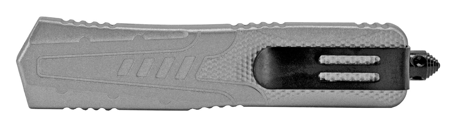 9" Angel Silver OTF Automatic Knife Black Tanto Serrated. Blade Material 440 Stainless Steel Blade Type Serrated Folding Action Out the Front Handle Construction Stainless Steel Features Belt Clip, Glass Breaker, and Nylon Carrying Case Blade Length 3.5" Handle Length 5.5" Overall Length 9"