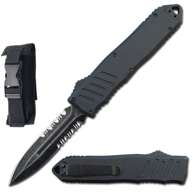 9" Havoc Black OTF Dual Action Automatic Knife Stonewash Dagger Serrated. The Black Havoc double action OTF knife is the perfect full-size knife for everyday carry. It's built for hard use and ready for action deployment. The 3.5 inch stonewashed finished 440A partially serrated stainless steel dagger style blade is hard sharpened and has a nice edge that's ready for use out of the box. The smooth ergonomic handles are made of high-quality Zinc Alloy with the button placement on the spine of the handle for comfortable use. Specifications Overall Length: 9 inch Blade Length: 3.5 inch Handle Length: 5.5 inch Blade: Stone Washed Finish Partially Serrated Dagger Style Handle Material: Zinc Alloy Features Automatic Out the Front Stainless Steel Blade Black Zinc Alloy Handle Pocket Clip FREE Nylon Pouch with Belt Loop Included