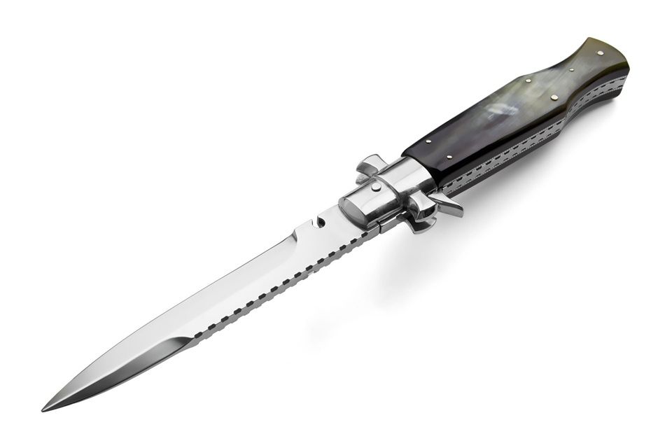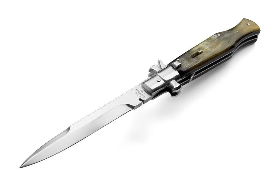 A.G.A Campolin Black Widow Brazilian Cow Horn File Work Italian Stiletto Automatic Knife. This is the fantastic " Black Widow " from the great knifemakers A.G.A Campolin in Maniago, Italy. This handmade automatic stiletto with a maltese crossguard has a square button/safety and comes with lever release mechanism. All components are made from nickel silver and the blade, spring and liners are filed work as used in the old tradition of switchblade production. The round bayonet blade is made of 440C stainless steel and has a mirror polish finish. The handle on this switchblade is a wasp body of brazilian cow horn. The quality and craftsmenship is excellent on this knife. It comes with a A.G.A Campolin certificate. Note: as it is a natural material, color, texture and pattern will vary from knife to knife. Overall Length: 28cm - 11" Blade Length: 12.5cm - 5" Blade thickness: 5mm - 0.2" Weight: 280gr - 9.9oz Blade Material: 440C Stainless Steel Handle Material: Brazilian Cow Horn Made in: Italy