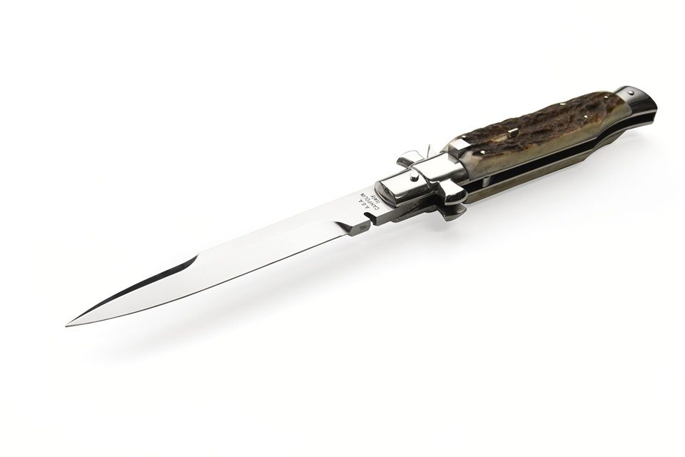 A.G.A. Campolin Black Widow Stag Horn Italian Stiletto Automatic Knife. This is the fantastic " Black Widow " from the great knifemakers A.G.A Campolin in Maniago, Italy. This handmade automatic stiletto with a maltese crossguard has a square button/safety and comes with lever release mechanism. All components are made from nickel silver and it has a 5mm spring and 1.2mm liners. The round bayonet blade is made of 440C stainless steel and has a mirror polish finish. The handle on this switchblade is a wasp body of stag horn. The quality and craftsmenship is excellent on this knife. It comes with a A.G.A Campolin leather pouch and certificate. Note: as it is a natural material, color, texture and pattern will vary from knife to knife. Overall Length: 28cm - 11" Blade Length: 12.5cm - 5" Blade thickness: 5mm - 0.2" Weight: 280gr - 9.9oz Blade Material: 440C Stainless Steel Handle Material: Stag Horn Made in: Italy