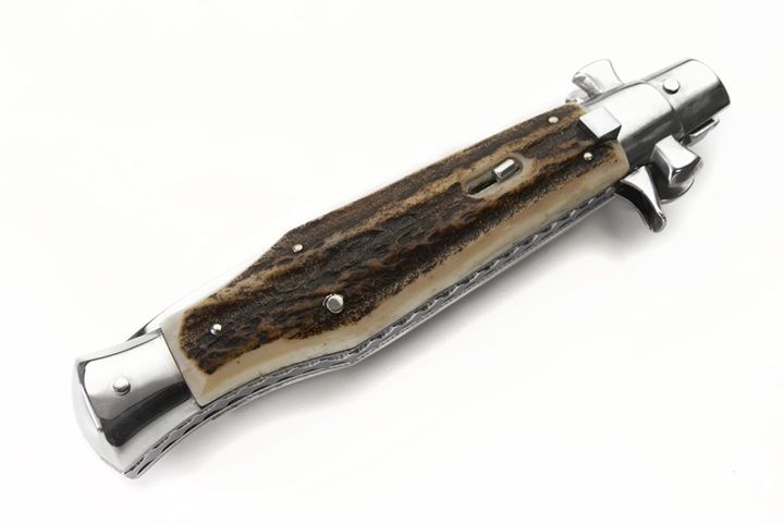A.G.A. Campolin Black Widow Stag Horn File Work Bolster Italian Stiletto Automatic Knife. This is the fantastic " Black Widow " from the great knifemakers A.G.A Campolin in Maniago, Italy. This handmade automatic stiletto with a maltese crossguard has a square button/safety and comes with lever release mechanism. All components are made from nickel silver and the blade, spring and liners are filed work as used in the old tradition of switchblade production. The round bayonet blade is made of 440C stainless steel and has a mirror polish finish. The handle on this switchblade is a wasp body of stag horn. The quality and craftsmenship is excellent on this knife. It comes with a A.G.A Campolin certificate. Note: as it is a natural material, color, texture and pattern will vary from knife to knife. Overall Length: 28cm - 11" Blade Length: 12.5cm - 5" Blade thickness: 5mm - 0.2" Weight: 280gr - 9.9oz Blade Material: 440C Stainless Steel Handle Material: Stag Horn Made in: Italy