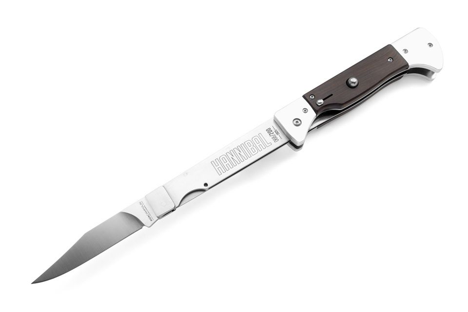 Hannibal A.G.A. Campolin: the first automatic BBQ knife! Born for lovers of automatic knives and stilettos, Hannibal is a unique collector’s item — and also perfect for those who want to impress at a barbecue. Inspired by the classic BBQ knife — with a long blade at the base to keep hands away from the heat — Hannibal redefines the concept with a push-button automatic opening and safety lock, plus a secure liner lock closing system. It’s the only knife on the market that combines both automatic and gravity-assisted opening. The blade, about two-thirds the length of the knife and finely sharpened, offers an unmatched blend of practicality and visual impact. The kick spring is a two-piece design, like the vintage switchblades. Its thick and sturdy spring measures an impressive thickness of 6mm. Be careful when closing the knife. It has a double liner lock: the first without the lock, then with the second 'fold' of the blade, the two parts of the blade lock into the handle. Watch the video carefully. The 2025 first edition is limited to just 600 individually numbered pieces, divided among three exclusive models: Snake Wood, Ebony Wood, and Imitation Ivory. Each version is numbered from 001/200 to 200/200. Every Hannibal comes with a certificate of authenticity and a box made of fine wood. An absolute must-have for every collector — or for anyone looking to turn their BBQ into a true spectacle! Overall lenght: 34.1cm – 13.4" Blade Lenght: 20 cm – 7.87" / sharp 9cm - 3.5" Blade Thickness: 0.3 cm – 0.11" Blade Material: Stainless steel Handle Material: Imitation Ivory Weight: 315 gr- 11.11 oz
