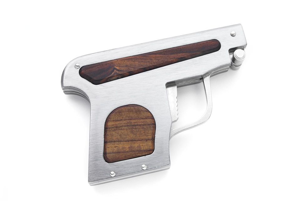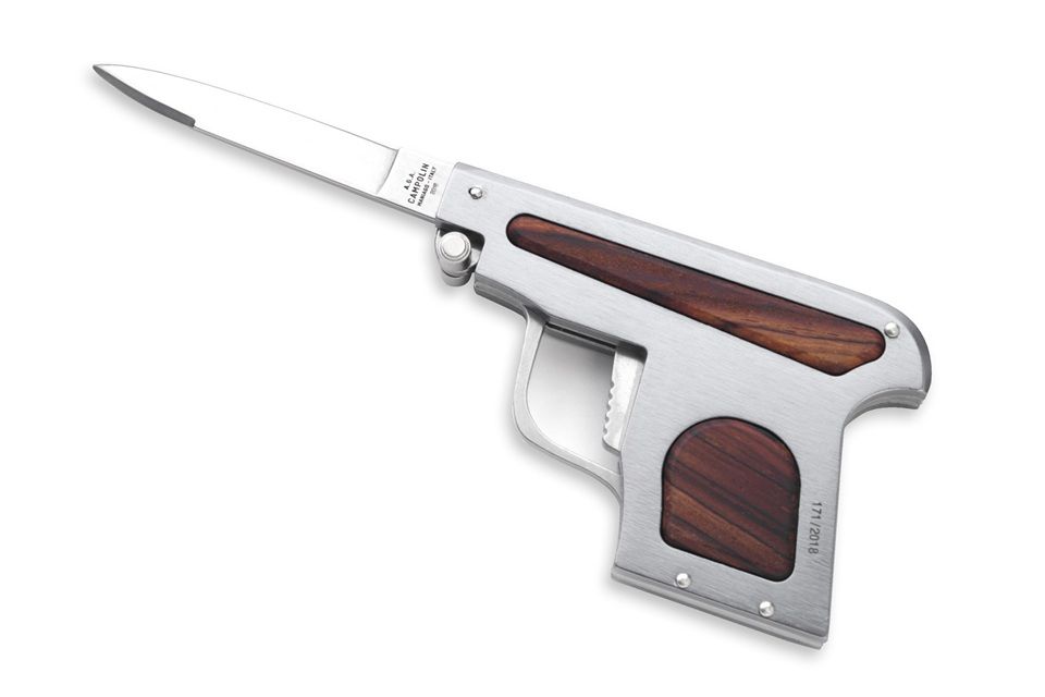 AGA Campolin Pistol Gun Italian Automatic Knife Cocobolo. Something really unique and new in the market made by the historical company AGA Campolin (Maniago,Italy). This special automatic knife is a remake of the old Maniago gun-letter opener made on 50's. A very limited production was made this year. Everyone has a serial number laser etched. The handle is made of aircraft anodized aluminium and the blade of 440C steel. The inlay are made with CNC handfinished cocobolo wood. This knife is not for EDC use, but for collectors who like a piece of italian knife history or like a letter opener. Please note: colour of the inlay can be different because it is a natural material and could vary one from the other inlay. Overall length: 16.7 cm - 6.57" Blade length: 7.3 cm - 2.87" Blade thickness: 3 mm - 0.11" Weight 173 gr - 6.1 oz. Blade material: 440C Steel Handle material: Cocobolo Wood Made in: Italy