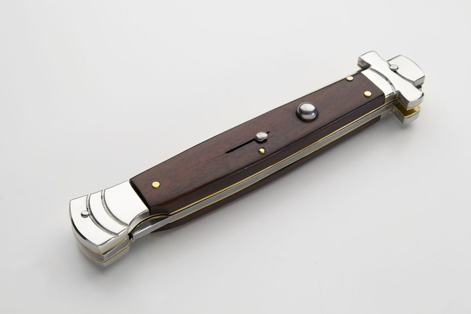 AGA Campolin 11" Maltese Cross Stiletto Automatic Santos Wood 5" Bayonet. This A.G.A. Campolin Maltese is a beautiful quality automatic stiletto. It features a 440A stainless steel bayonet blade with mirror polished finish. The solid nickel silver bolsters remind of the maltese cross and it has a lock back release mechanism. The handle is made of santos wood and the liners of brass. A beautiful piece to add to your collection. Note: as it is a natural material, color, texture and pattern will vary from knife to knife. Overall Length: 28cm - 11" Blade Length: 12,5cm - 5" Blade thickness: 3,5mm - 0.14" Weight: 220gr - 7.7oz Blade Material: 440A Stainless Steel Handle Material: Santos Wood Frame Material: Brass Made in: Italy
