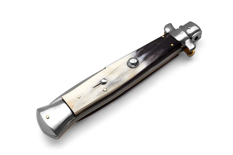 AGA Campolin 15 Inch Italian Stiletto Automatic Knife Brazilian Horn Bayo. Overall Length: 38cm - 15" Blade Length: 18cm - 7" Blade thickness: 5.0mm - 0.2" Weight: 390 gr. Blade Material: Stainless steel AISI 420 Handle Material: Brazilian cow horn Frame Material: Brass Made in: Italy