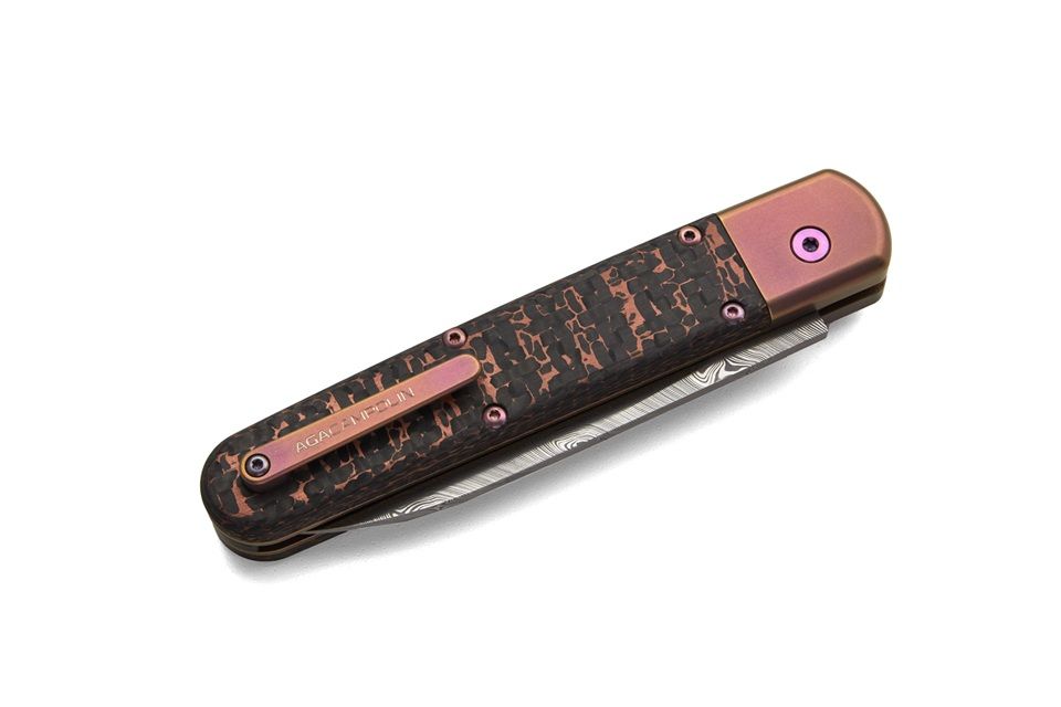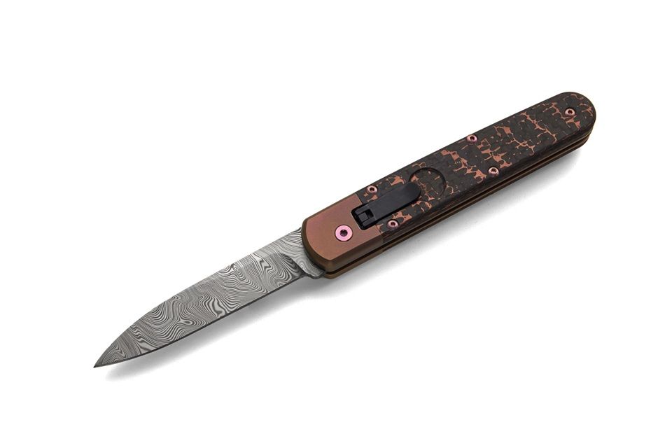 AGA Campolin Automatic Leverlock Baron Elite Limited Edition Titanium Knife Damascus Carbon Fiber. We are excited to present you the latest switchblade from the italian knifemaker company A.G.A Campolin the Baron Elite. This automatic knife is the modern evolution of the Baron build with the same leverlock mechanism like the successful "Zero". This Baron Elite is a Limited Edition of 100 pieces made in 02/2023. It features a damascus Björkmans twist drop point blade. The handle on this switchblade is made of carbon fiber and copper scales and it has titanium bolsters and liners, the screws and clip are pink oxidated titanium. The springs are very easy to replace and the Baron Elite Limited Edition comes with an extra spring in the carbon paper box and certificate. Overall length: 20cm - 7.9" Blade length: 8.5cm - 3.3" Weight: 190g - 6.7oz Blade material: Damascus Handle material: Carbon Fiber, Copper Made in: Italy