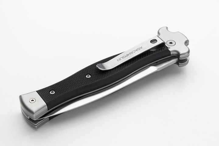 AGA Campolin Zero Black G-10 Automatic Leverlock Knife Satin Dagger. Overall length: 23 cm - 9" Blade length: 10 cm - 3.94" Blade thickness: 3.5 mm - 0.14" Weight: 170g - 5.99oz Blade material: N690Co stainless steel Handle material: G-10 Black Made in: Italy