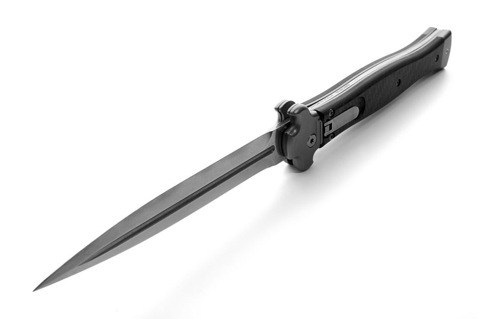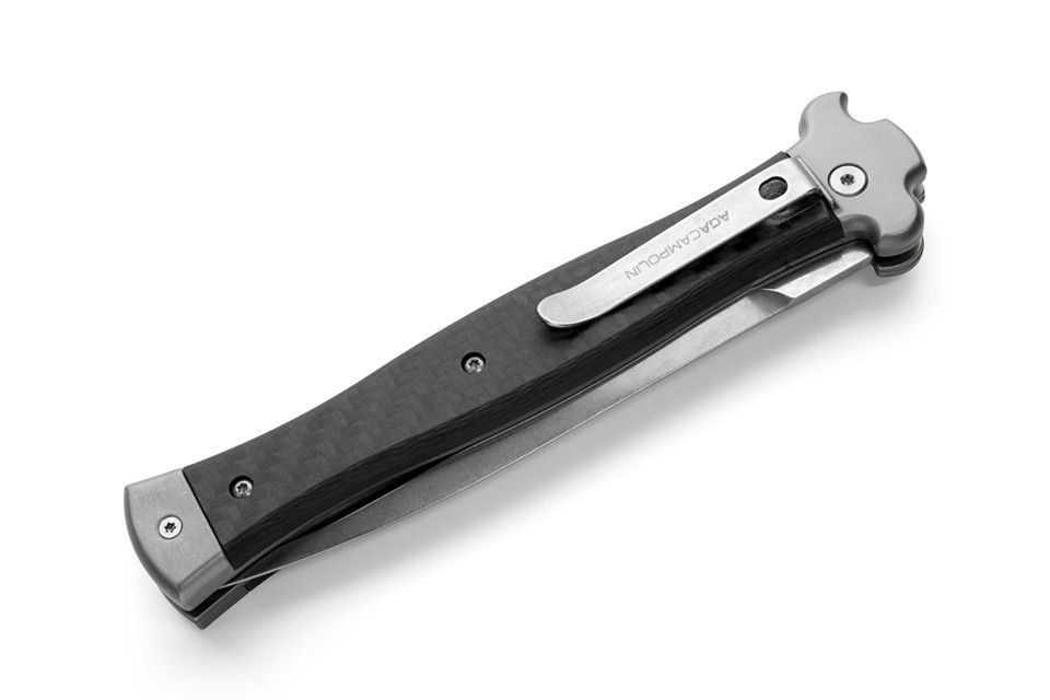 AGA Campolin Zero + Carbon Fiber Leverlock Automatic Knife Dagger Polished Plain. ZERO+ is a modern stiletto with leverlock mechanism and is the longest leverlock available!! It has a M390 stainless steel dagger blade with satin finish and a solid AISI 430 steel glass blasted bolster. The double spring gives faster action and guarantees longer durability. The inverted lever gives a quick opening action. The handle is made of carbon fiber. The stainless steel pocket clip can be easily removed and replaced with a steel shield. ZERO+ is covered by 1 year warranty from the original end user's purchasing date. Overall length: 26cm - 10.25" Blade length: 12cm - 4.7" Blade thickness: 3.5mm - 0.14" Weight: 215g - 7.6oz Blade material: N690Co Stainless Steel Handle material: Carbon Fiber Made in: Italy
