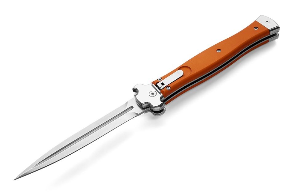 AGA Campolin Zero + Orange Aluminum Leverlock Automatic Knife Dagger Polished Plain. ZERO+ is a modern stiletto with leverlock mechanism and is the longest leverlock available!! It has a stainless steel N690Co Daga blade with polished mirror finish and a solid AISI 430 steel glass blasted bolster. The double spring gives faster action and guarantees longer durability. The inverted lever gives a quick opening action. The Turquoise Aluminium handle has a 3d texture for a better grip. The stainless steel pocket clip can be easily removed and replaced with a steel shield. ZERO+ is covered by 1 year warranty from the original end user's purchasing date. Overall length: 26cm - 10.25" Blade length: 12cm - 4.7" Blade thickness: 3.5mm - 0.14" Weight: 215g - 7.6oz Blade material: N690Co Stainless Steel Handle material: Aluminium Made in: Italy
