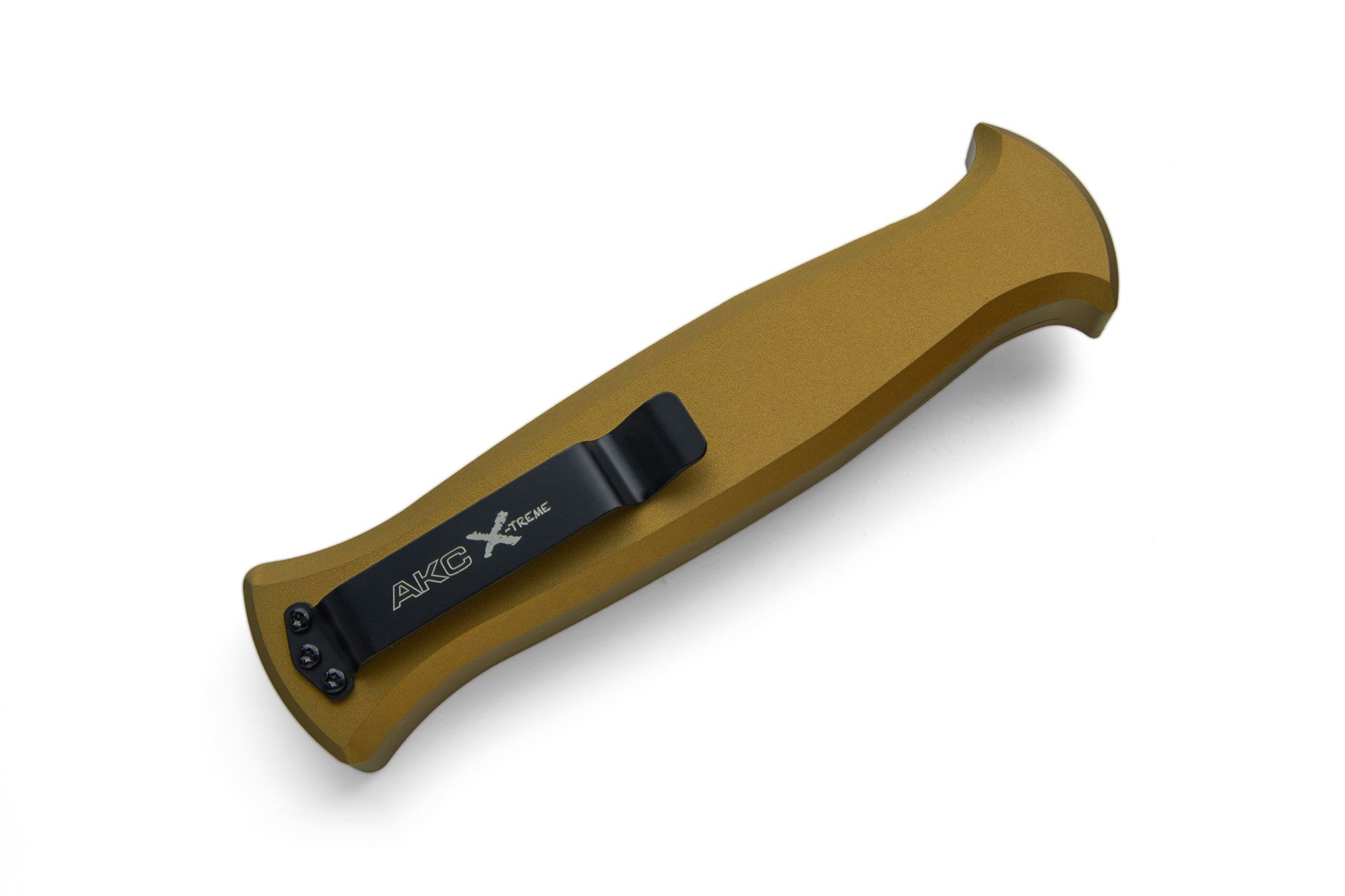 The AKC X-TREME made with modern materials and an aggressive italian design increased the standard of their OTF production. This new automatic model "EVO", short for EVOLUTION, is the modern version of an old OTF Angelo Campolin Sr. made in the 70's for the Solingen/Germany company Otello. The ergonomic tan handle and button are made using solid CNC worked 6061-T6 aircraft aluminium. The plain grind blade on this switchblade is made of AUS-8 japanese steel with a HRC of 58-59 and has a PVD coated finish. It includes a black pocket clip. This OTF fires fast and has minimum bladeplay. Overall Length: 21.5 cm - 8.46" Blade Length: 9cm - 3.54" Blade Thickness: 3mm - 0.12" Weight: 120gr - 4.2oz Blade Material: AUS-8 Japanese Steel Handle Material: Aluminium Made in: Taiwan