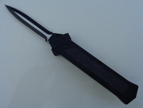 AKC F-16 Black Grip D/A OTF Automatic Knife Two Tone Dagger. Overall Length: 20cm - 8" Blade Length: 8.5cm - 3.35" Blade thickness: 3mm - 0.12" Weight: 88 g - 3.10 oz. Blade Material: 440A Stainless steel Handle Material: Aluminium Black Inlay Material: Black Grip