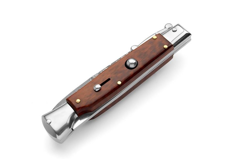 AKC Swinguard 9" Italian Automatic Stiletto Snakewood Damascus. This real Italian Stiletto in the swinguard style is sure to be the next item in your Italian knife collection. The bayonet blade releases powerfully at the push of a button. The handle is crafted from beautiful premium material. This pocket knife includes a sliding safety to protect against accidental release and the lockback is secure. If you're looking for a beautiful Italian blade, this is the one for you. Italian Stilettos are handmade using traditional knife-making techniques. As a result they will have a more rustic fit and finish than most production knives. These traditional Italian knives are intended more for collection and display, rather than hard EDC use. Overall lenght: 23cm – 9" Blade Lenght: 9.65 cm – 3.8" Blade Thickness: 0.25cm – 0.10" Weight: 130.4 gr- 4.6 oz Blade Material: Stainless steel Handle Material: Snake Wood