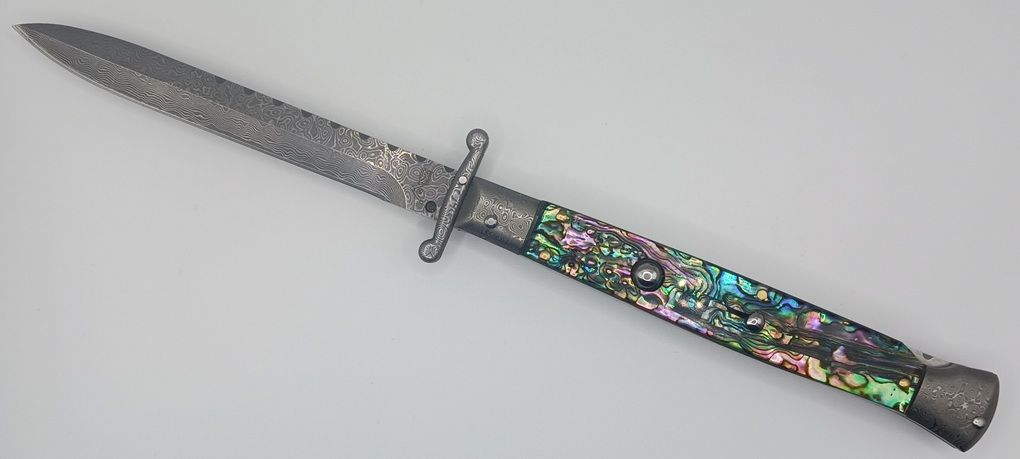 AKC World 11" Abalone File Work Damascus Italian Swinguard Automatic Knife. We present a classic Italian-style knife: the 28 cm Swinguard. Elegant, featuring a fast automatic opening mechanism and rock-solid lock-up when deployed, this knife represents an excellent purchase — especially considering its outstanding quality-to-price ratio. The handle is crafted from Abalone, while the blade and liners are made of Damascus steel. A special detail that adds a real touch of class is the beautifully executed file work on the spring. Overall length: 28cm – 10,90" Blade Length: 11,4cm – 4,60" Blade Thickness: 0,3cm – 0,11" Weight: 168gr - 5.92oz Blade Material: Damascus Handle Material: Abalone Frame material: Damascus