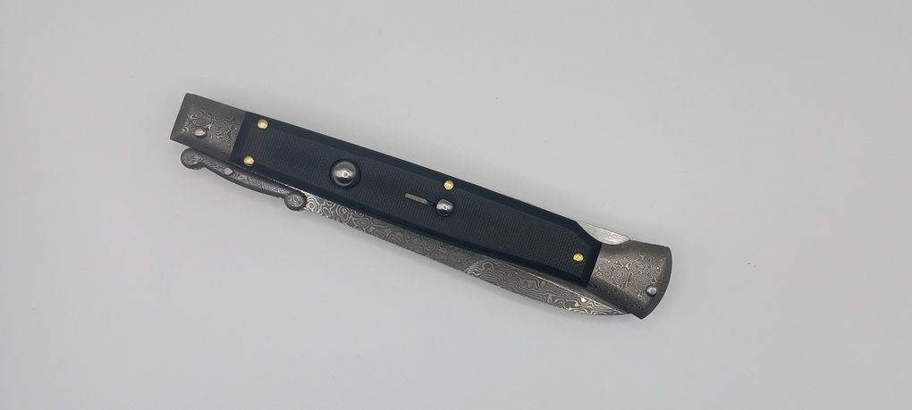 AKC World 11" Ebony Wood Damascus Italian Swinguard Automatic Knife. We present a classic Italian-style knife: the 28 cm Swinguard. Elegant, featuring a fast automatic opening mechanism and rock-solid lock-up when deployed, this knife represents an excellent purchase — especially considering its outstanding quality-to-price ratio. The handle is crafted from [Ebony, while the blade and liners are made of Damascus steel. Overall length: 28cm – 10,90" Blade Length: 11,4cm – 4,60" Blade Thickness: 0,3cm – 0,11" Weight: 168gr - 5.92oz Blade Material: Damascus Handle Material: Ebony Frame material: Damascus