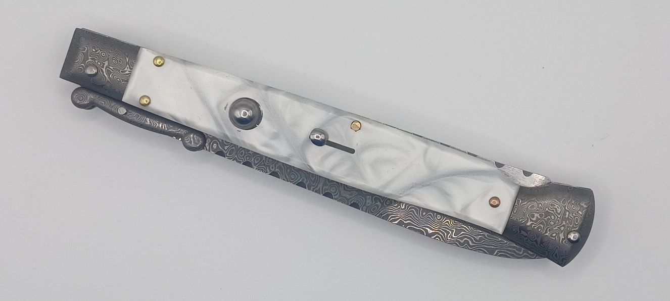 AKC World 11" Imitation Pearl File Work Damascus Italian Swinguard Automatic Knife. We present a classic Italian-style knife: the 28 cm Swinguard. Elegant, featuring a fast automatic opening mechanism and rock-solid lock-up when deployed, this knife represents an excellent purchase — especially considering its outstanding quality-to-price ratio. The handle is crafted from Imitation Pearl, while the blade and liners are made of Damascus Steel. A special detail that adds a real touch of class is the beautifully executed file work on the spring. Overall length: 28cm – 10,90" Blade Length: 11,4cm – 4,60" Blade Thickness: 0,3cm – 0,11" Weight: 172gr - 6.1oz Blade Material: Stainless steel Handle Material: Imitation Pearl Frame material: Damascus Steel