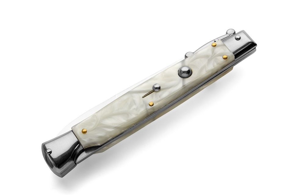 AKC World 11" Imitation Pearl Italian Swinguard Automatic Knife. We present a classic Italian-style knife: the 28 cm Swinguard. Elegant, featuring a fast automatic opening mechanism and rock-solid lock-up when deployed, this knife represents an excellent purchase — especially considering its outstanding quality-to-price ratio. The handle is crafted from Imitation Pearl, while the blade and liners are made of stainless steel. Overall length: 28cm – 10,90" Blade Length: 11,4cm – 4,60" Blade Thickness: 0,3cm – 0,11" Weight: 171gr - 6oz Blade Material: Stainless steel Handle Material: Imitation Pearl Frame material: Stainless steel