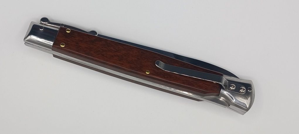 AKC World 11" Italian Stiletto Automatic Swinguard Snake Wood (4.6" Polished). We present a classic Italian-style knife: the 28 cm Swinguard. Elegant, featuring a fast automatic opening mechanism and rock-solid lock-up when deployed, this knife represents an excellent purchase — especially considering its outstanding quality-to-price ratio. The handle is crafted from Snake wood, while the blade and liners are made of stainless steel. Overall length: 28cm – 10,90" Blade Length: 11,4cm – 4,60" Blade Thickness: 0,3cm – 0,11" Weight: 170gr - 6oz Blade Material: Stainless steel Handle Material: Snake Wood Frame material: Stainless steel