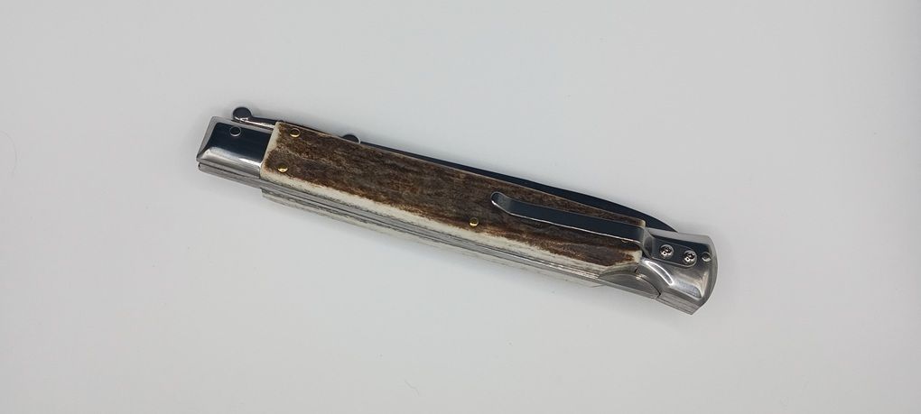 AKC World 11" Stag Horn Italian Swinguard Automatic Knife. We present a classic Italian-style knife: the 28 cm Swinguard. Elegant, featuring a fast automatic opening mechanism and rock-solid lock-up when deployed, this knife represents an excellent purchase — especially considering its outstanding quality-to-price ratio. The handle is crafted from stag horn, while the blade and liners are made of stainless steel. Overall length: 28cm – 10,90" Blade Length: 11,4cm – 4,60" Blade Thickness: 0,3cm – 0,11" Weight: 179gr - 6.31oz Blade Material: Stainless steel Handle Material: Stag Horn Frame material: Stainless steel