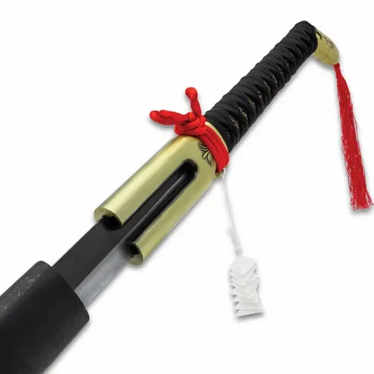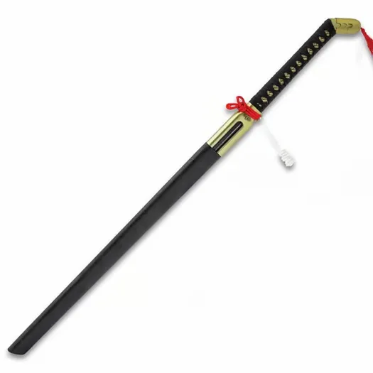 This Anime Fantasy Sword Cane was inspired by the anime show that you just can’t get enough of and the weapon you want to get your hands on! The sword cane is uniquely crafted in a design that you just might wanna pair with your favorite hat and clogs. It has a 28 1/2”, display-edged blade with a two-toned black and silver finish, extending from an extended gold metal blade collar. The wooden handle is wrapped in white, faux rayskin and black cord and it features a particularly unique gold metal cane handle pommel with a red tassel. The 41 1/2” overall fantasy sword cane fits seamlessly into a matte black, wooden scabbard-style sword cane shaft. This sword cane was inspired by the anime show that you just can’t get enough of and the weapon you want to get your hands on It has a 28 1/2”, display-edged blade with a two-toned black and silver finish, extending from an extended collar The wooden handle is wrapped in white, faux rayskin and black cord and it features a gold metal handle with a red tassel The 41 1/2” overall fantasy sword cane fits seamlessly into a matte black, wooden scabbard-style sword cane shaft