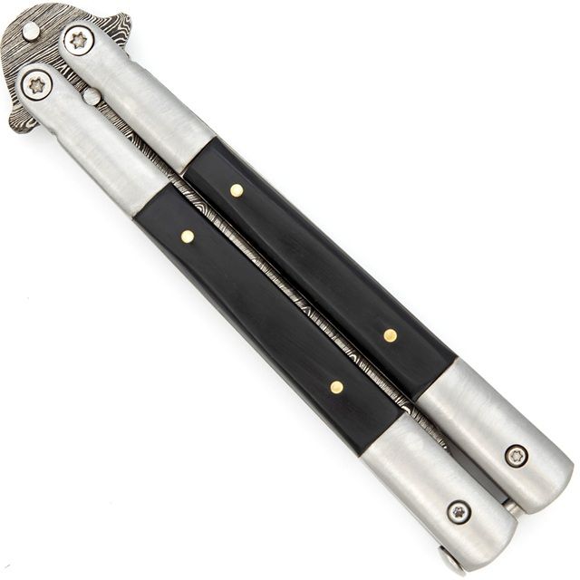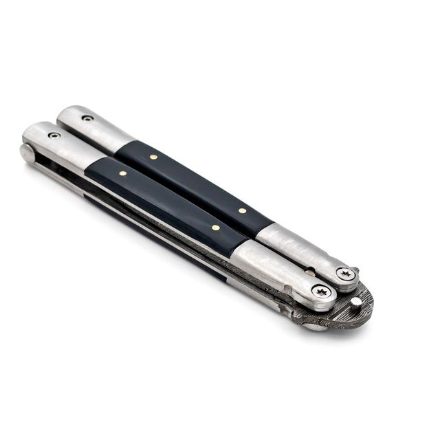 Best Price Heavy Duty Black Butterfly Knife Damascus Blade Drop Point. This Black Steel Balisong Butterfly Knife is a reliable, well-balanced addition to any knife reseller’s inventory. Measuring 8.75 inches overall, it features a black anodized stainless steel blade and a solid steel handle for long-lasting performance. The safety latch locks the blade in place during carry or storage. Ideal for training, flipping practice, or tactical purposes, it’s a versatile product that appeals to collectors, martial artists, and outdoor enthusiasts alike. Specifications: Overall Length: 8.75 Inches Blade Length: 4 Inches Blade Material: Stainless Steel; Anodized Black Finish Blade Thickness: 2.13 mm Handle Length: 4.75 Inches Handle Material: Stainless Steel, Black Features: Black Blade Finish for Tactical Appeal Heavy-Duty Steel Handle Functional Safety Latch Excellent for Flipping or Display