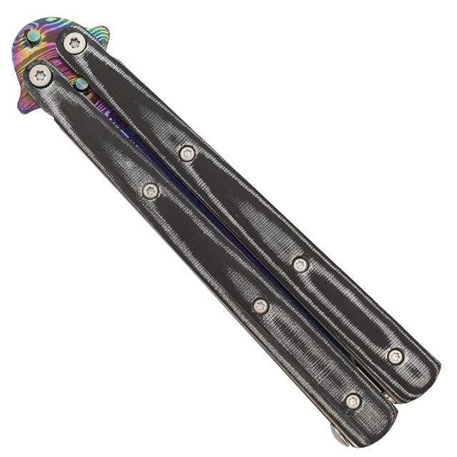 Add a premium performer to your Collection with the Micarta Simple Butterfly Knife, featuring a drop point blade made of 440 stainless steel with a stunning titanium Damascus finish. Designed for fluid flipping and long-term durability, this knife is both functional and collectible. The Micarta handle provides lightweight comfort and textured grip, while the safety latch and double pin build make it ideal for safe everyday use. A 1-inch fuller along the blade boosts both structure and edge appeal. Specifications: Overall Length: 9 Inches Blade Length: 4 Inches Blade Material: 440 Stainless Steel Blade Style: Drop Point Blade Finish: Titanium Damascus Blade Thickness: 2.50 mm Handle Length: 4.75 Inches Handle Material: Micarta Blade Feature: 1-Inch Fuller Includes: Safety Latch, Double Pin Features: Drop Point Blade w/ Titanium Damascus Look Textured Micarta Handle – Lightweight and Durable Strong Double Pin Construction Includes Safety Latch for Secure Handling