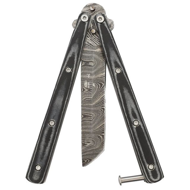 Best Value Heavy Duty Black Micarta Butterfly Knife Tanto Point Damascus Plain. Sporting a Damascus steel tanto point blade, the slim build and good weight of this balisong butterfly knife delivers nice action in an attractive package. The distinctive Micarta construction handle is decorated with an attractive black and grey wooden pattern which is attached to the steel inner framing with a torque screw. A metal safety latch is included to lock the blade into place when it is not in use as well as when it is deployed. The blade offers blood grooves on both sides allowing for a more balanced blade. Also known as a balisong, a butterfly knife or fan knife is a folding pocket knife with two handles counter-rotating around the tang such that, when closed, the blade is concealed within grooves in the handles. Butterfly knives are especially useful in situations where it is inconvenient to use both hands to open a knife. Please make sure to check your local laws regarding the procession and import of these knives. Overall Length: 9 Inches, Blade Length: 4 Inches