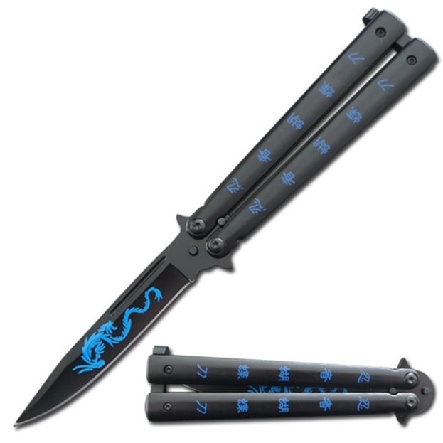 Blue Dragon Lightweight Butterfly Knife. This blue dragon butterfly knife has an overall length of 9 inches. It is lightweight and sturdy. The handle is 5 inches length and the blade is 3.75 inches. This magnificent balisong knife is a perfect piece to have in your arsenal. The stainless steel blade makes it a sturdy knife. Blade Length: 3.75 Inches Handle Length: 5 Inches Overall Length: 8.75 Inches Dragon Design On Blade Blade Material: Stainless Steel Locking Mechanism: Latch Weight: 5oz