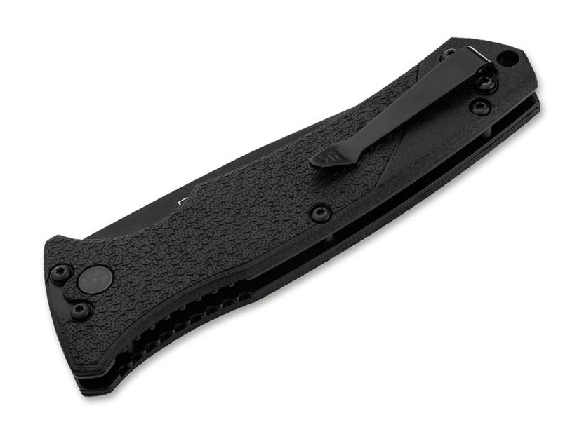 Boker Heckler & Koch Black Automatic Knife Tanto Black Serrated. The Heckler & Koch automatic knives FD01 & FD02 are tactical no-nonsense function folders of the purest calibre. The reliable mechanisms with a side blade opening, coil spring and button lock have proven themselves hundreds of thousands of times over in the Kalashnikov and Boker Plus series of switchblade knives for more than a decade. The lock is equipped with an additional side-mounted slide-lock for safe handling. The D2 steel blades are black coated. The handle is made of steel liners and fibre-reinforced nylon (FRN). The nylon has the characteristic moon and knob texture of the handles of Heckler & Koch military and government handguns. The knives are equipped with a pocket and belt clip for tip-up (r) carry and are available in two versions with different blade shapes. The Heckler & Koch FD01 is the fully tactical version of the tactical switchblade knife with a robust tanto blade and half serrated edge (combo edge) for cutting fibrous materials such as webbing and rope. Type: Pocket Knives Brand: Heckler & Koch Overall Length: 7.91 in Blade Length: 3.27 in Blade Thickness: 0.12 in Weight: 3.95 oz Blade Material: D2 Handle Material: FRN Opener: Push Button Opening: Automatic Lock Type: Button Lock Made in: USA Color: Black Blade Color: Black Item Number: 01HK502