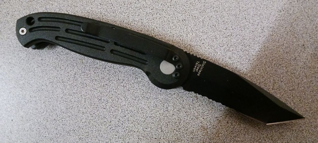 Boker Magnum Mini Black Tanto Serrated Automatic Knife Black. This knife looks fierce with its magnum tanto, corrosion-resistant coating blade. The knife pops out of the handle with a lot of force. The Boker Magnum Auto Series is made by knife craftsmen in one of the most respected knife factories in the world. Boker engineered this knife in Germany, had it made in the Taiwan workshop, then American craftsmen finished them out into one of the highest quality international knives produced. Handle: Lightweight Aluminum Blade: 2.75 Inch bead blast blade of 420 stainless steel Push button locking system Overall open length: 6.25" Weight: 2.4 ounces