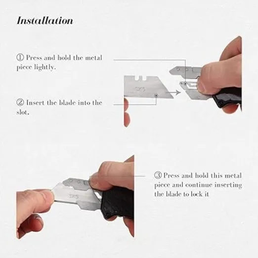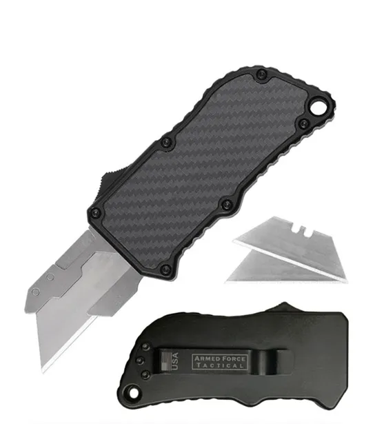 Box Cutter D/A OTF Automatic Knife Carbon Fiber 3.5" Blade. Introduces the ultimate box cutter that will revolutionize the way you work. This automatic knife features an out-the-front (OTF) design that allows you to easily and quickly extend and retract the replaceable blade with just one hand. The credit card size and pocket clip allow the user to conveniently carry it in the pocket. The super sharp and replaceable razor blade will cut through anything from cardboard boxes to thick ropes and more. Specifications: Overall length: 5.7 Inches Closed length: 3.5 Inches Width: 1.77 Inches Weight: 0.22 lbs. Features: Utility Knife, Practical and sturdy EDC for daily life. Stainless Steel Blades & Easy Change with 2 extra blades. Ergonomic design Carbon Fiber Handle With Clip
