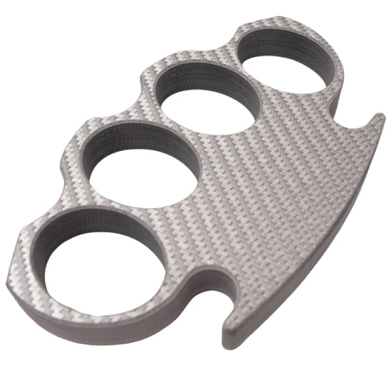 Carbon Fiber Brass Knuckle Paperweight Silver. 4.65 inch length 2.75 inch height 1.35 inch finger holes Half an inch thick! 100% solid carbon fiber