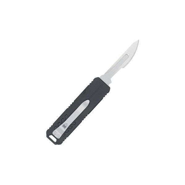 CobraTec Black Scalpel Auto, 5" Overall, Aluminum Handle. CobraTec Black Scalpel Auto, 5" Overall, Aluminum Handle. Our OTF Scalpel is crafted from CNC-machined 6061-T6 aircraft-grade aluminum. It offers a lightweight yet robust build designed to withstand everyday use. The tool features a quick-deploy mechanism and accepts standard size 23 replaceable blades for surgical-grade sharpness. Built for everyday carry, it includes a secure pocket clip and a lanyard hole for versatile carry options. Ideal for field work, as a box cutter, detailed crafting or for emergency kits. NOTE: Use proper tools and care when changing disposable blades. See Video. Specifications Blade: Replaceable size 23 Scalpel Handle Length: 3 inches Overall Length 5 inches Weight: 1.3 ounces Right Hand Carry Clip Lanyard Loop