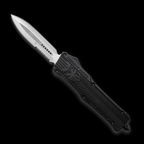CobraTec CTK-1 Black D/A OTF Auto, 3.75" D2 Dagger Single Serrated Blade, Aluminum Handle. CobraTec Black CTK-1 double action OTF Knife. The CTK-1 is one of the best out the front knife (OTF) for general use and a great choice as your everyday carry. The handle is designed from high-grade aluminum alloy and features a D2 steel blade. The knife is ambidextrous as the pocket clip can be switched to either side of the handle, depending on your preference. This OTF knife features a pocket clip, a glass breaker for emergencies and includes a nylon sheath. All CobraTec OTF knives are backed by our LIFETIME WARRANTY. 9 ounces Dual Action OTF 3.75 inch D2 Steel Blade 5.75 inch high-grade aluminum Alloy Handle 9.5 inches in total length with Glass Breaker