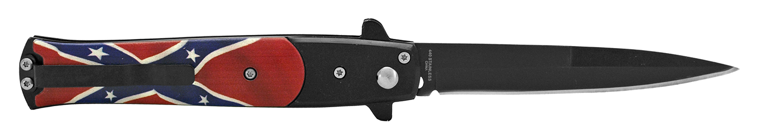 Confederate Flag 8.75" Stiletto Automatic Knife Black Bayo. Blade Material 440 Stainless Steel Blade Type Razor Folding Action Switchblade Handle Construction Stainless Steel and ABS Plastic Features Belt Clip and Safety Lock for Push Button Blade Length 3.88" Handle Length 4.88" Overall Length 8.75"