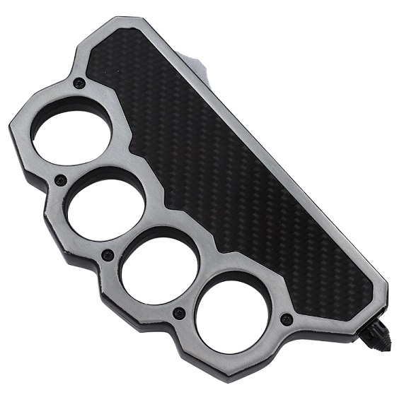 Damascus Carbon Fiber D/A OTF Trench Knuckle Automatic Knife Dagger. Push the switch located on the side of the handle to deploy the hidden blade. Damascus steel double-edged dagger point blade! The black and silver handle is made of strong zinc aluminum and features 4 large holes to slip your fingers into for a tight grip and extra support. A carbon fiber inlay on either side of the handle. An anodized black pocket clip and glass breaker are also featured on the handle. Included is a quick-release black nylon carrying case belt loop. Overall Length: 10 inches, Blade Length: 4 inches