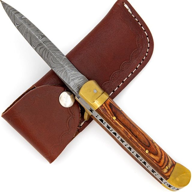 Damascus Great Red Wood Lever Lock Automatic Knife. Damascus steel was a type of steel used for manufacturing sword blades in the Near East made with wootz steel. These swords are characterized by distinctive patterns of banding and mottling reminiscent of flowing water. Such blades were reputed to be tough, resistant to shattering and capable of being honed to a sharp, resilient edge. Today you find this beautiful steel being used in hunting and pocket knives. This Damascus blade comes with an automatic function. Just push the lever down and watch the magic. The handle is constructed of wood and stained with a red stained finish. Brass pins have been used to mount the wooden plates onto the brass frame. Both the lever and pommel comes in solid polished brass. The blade comes in a random pattern and made from Damascus steel with 176 blade layers that have been tempered at around 54 to 55. The chiseled spine just adds to the piece. Add it to your collection while supplies last. Overall Length: 9.12 Inches. Weight: 0,5 lbs.