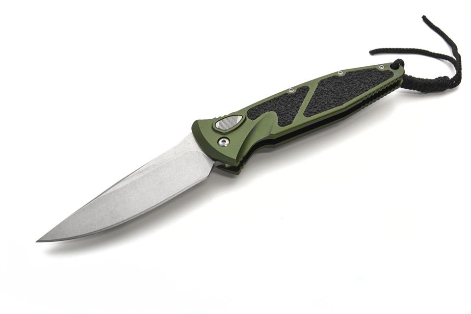 Dark Green Side Opening Automatic Knife Drop Point. Stonewashed 4 inch blade. 9 inches overall. Very well built with a hard snap when you push the button.