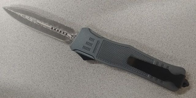 Delta Air Force Women OTF Automatic Knife Damascus Serrated Dagger. Overall Length: 9.48 Inches Blade Length: 3.83 Inches Blade Width: 0.76 Inch Blade Thickness: 2.72 mm Blade Construction: Steel Handle Construction: Zinc Alloy Handle Length: 5.68 Inches Includes: Black Nylon Sheath