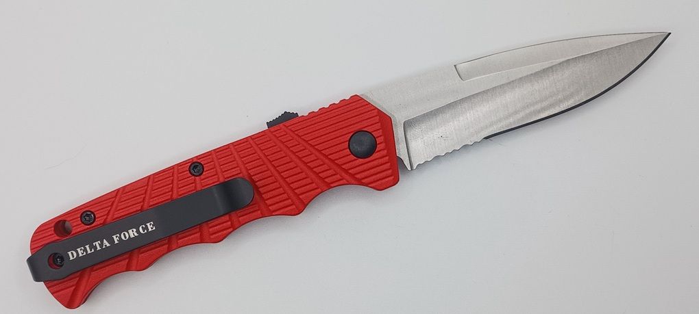 Delta Force Red Side Opening Automatic Knife Satin Drop Point Serrated. 3.5" bayonet blade 7.75 inches overall length with a pocket clip and safety switch. Heavy construction all metal handle.