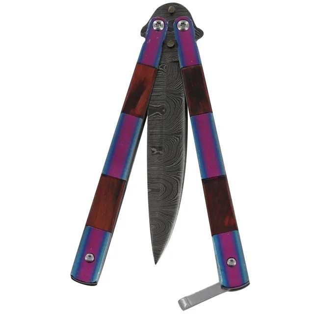 Double Feature Damascus Steel Heavy Duty Fanning Butterfly Knife. The blade of this butterfly knife is made from 1095/15N20 Damascus steel in a drop point style for precise cuts and slashes. A billet is forged, hammered, and heated so that a gorgeous pattern shows prominently on the blade. The HRC is around 54 to 55 with 180 true blade layers. The handle is double walled with a steel inner frame. The outer frame features both steel and wood mounts, with the steel featuring a blue & fuchsia finish. There is also a safety latch, so the knife won’t come open when not in use. Overall Length: 8.75 Inches, Blade Length: 4 Inches