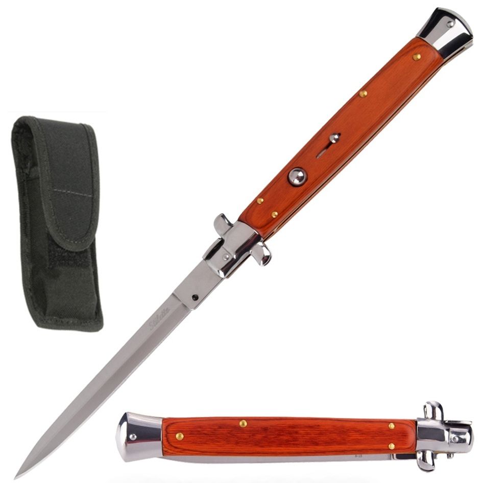 Extra Large 13 Inch Godfather Stiletto Automatic Knife Rosewood. This gigantic switchblade sits at 12.5" overall length. A push of the button flings the 5" blade open. Each knife comes with a nylon sheath and has a safety switch on the handle to prevent accidentally opening. Blade: 5" Overall: 13" Closed: 7"