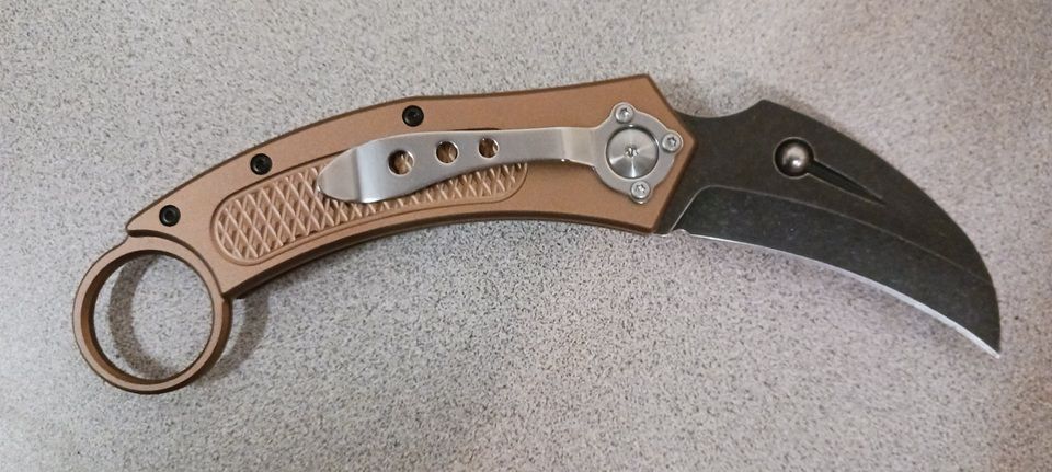 Fort Knife Works Karambit Gold S/O Auto Knife BSW. This side open knife has an Aluminum Handle and an ATS 34 Steel Hawkbill Blade with a Black Stonewash finish. These knives are great for rescue situations, or cutting things like hay bail bindings. This knife is made in solingen germany. overall length of 7 inches with a 2.5" blade. Comes with a pocket clip for easy carry in your pocket.